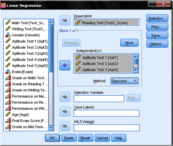 To answer our research question we need to enter the variable reading scores as the dependent variable in our multiple linear regression model and the aptitude test scores (1 to 5) as independent variables. We also select stepwise as the method. The default method for the multiple linear regression analysis is ‘Enter‘, which means that all variables are forced to be in the model. But since over-fitting is a concern of ours, we want only the variables in the model that explain additional variance. Stepwise means that the variables are entered into the regression model in the order of their explanatory power.