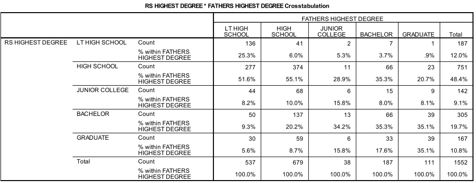 Essentially, if a high count in one category is related to a high or low count in another category of another variable. This might easily observe by circling the highest count (usually given as a percentage) in each row and looking for the pattern of circles. For example, there is clear a line from the upper left portion of the table to the lower right, indicate a positive relationship. Note that direction can ONLY determine when both variables measure at the ordinal level, as there is no ranking of nominal variables.