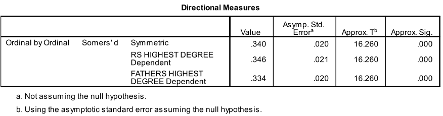 As seen below, Somer’s d is primarily an asymmetric measure of association. Generally, which means that whichever variable treat as the dependent variables matters (though it can conceptualize as symmetric). Somer’s d is a Proportional Reduction in Error (PRE) measure. So it interpret as the improvement in predicting the dependent variable. Particularly that can attribute to knowing a case’s value on the independent variable. A value of .346 for the crosstabulation above (treating the respondent’s education as dependent). Meanwhile it indicates that we improve our guess of respondent education by 34.6% by knowing father’s education.