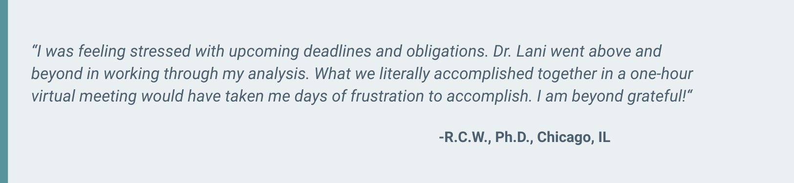 “I was feeling stressed with upcoming deadlines and obligations. Dr. Lani went above and beyond in working through my statistical analysis. What we literally accomplished together in a one-hour virtual meeting would have taken me days of frustration to accomplish. I am beyond grateful!”
