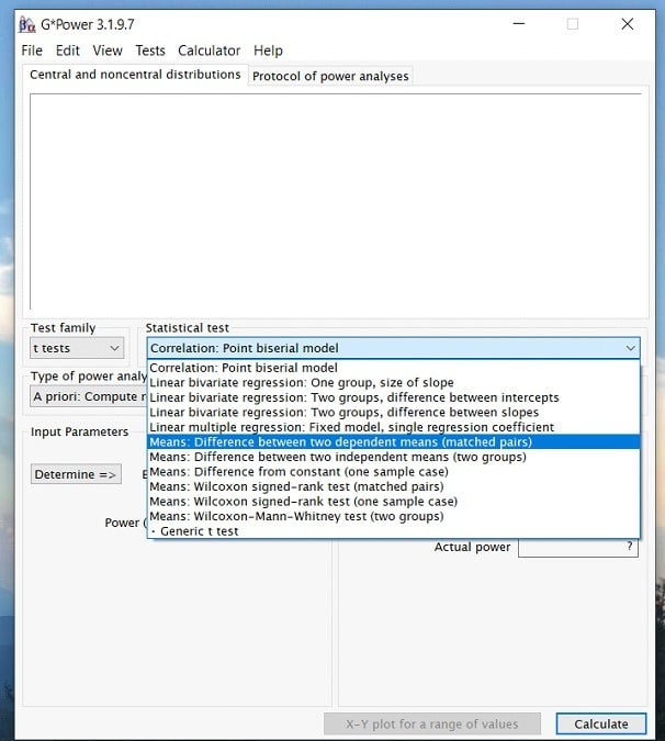 Step 2: Once you have opened the program. Click on the Test family drop down menu and select the type of statistic you are interested in. For a paired samples t-test, we will select the t-test option. However, if you are interested in an ANOVA or Regression then you would select the F test option.