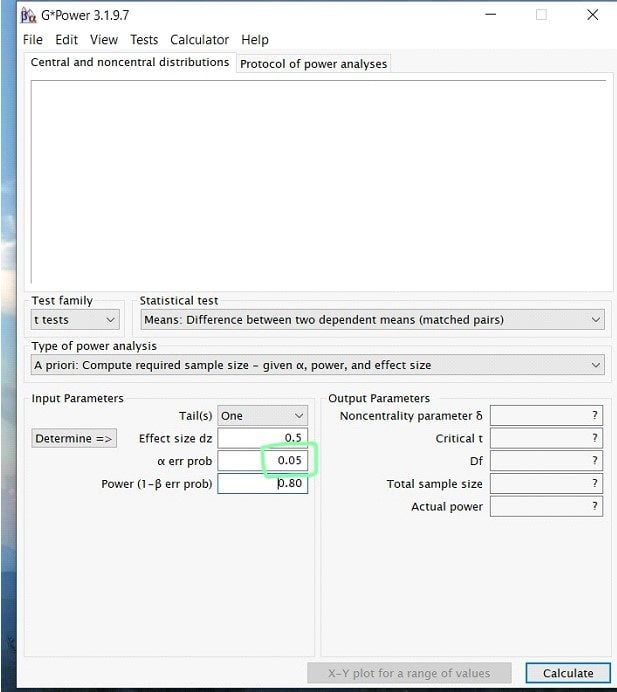 Step 5: Next to input the alpha level. For this, unless previous research has given you a reason to lower the value, it is a safe bet to always stay at alpha= .05.
