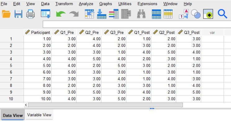 For this example, let’s say we have data from 10 participants. Each participant completed both a pretest and a posttest assessment. The assessment consisted of three questions (Q1, Q2, and Q3) that participants answered using a 1 to 5 Likert scale. Therefore, each participant has provided answers to three pretests questions and three posttest questions. The first image below shows what the data should look like in SPSS’s “Data View.”