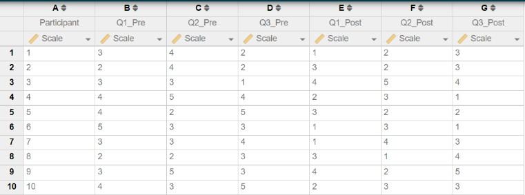 The first column labeled “Participant” contains the identification numbers for our 10 participants. Assigning participants an identification number (or having some other kind of identifier) allows us to match their pretest and posttest responses. The next three columns (Q1_Pre, Q2_Pre, and Q3_Pre) contain the participants’ pretest responses. Similarly, the last three columns (Q1_Post, Q2_Post, and Q3_Post) contain the participants’ posttest responses. Notice that underneath these column labels we have 10 rows of data corresponding to our 10 participants.