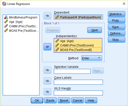 3) The dependent variable does not matter in this analysis, so move any scale level variable into this box (you can simply enter participant ID numbers as the dependent variable if there are no scale variables available in your data). Move the variables that you want to examine multivariate outliers for into the independent(s) box.